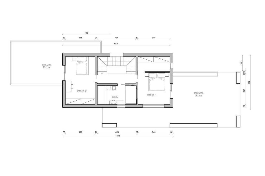 Il secondo piano invece mostra la zona notte con tre camere, due matrimoniali e una singola e un bagno finestrato con vasca.